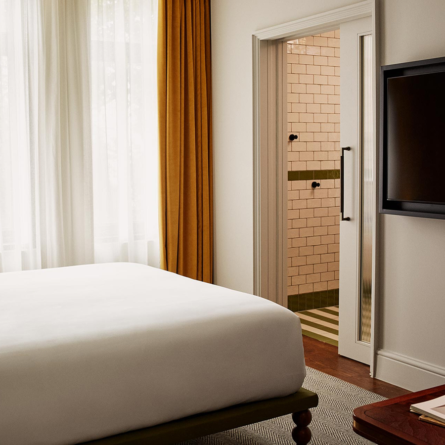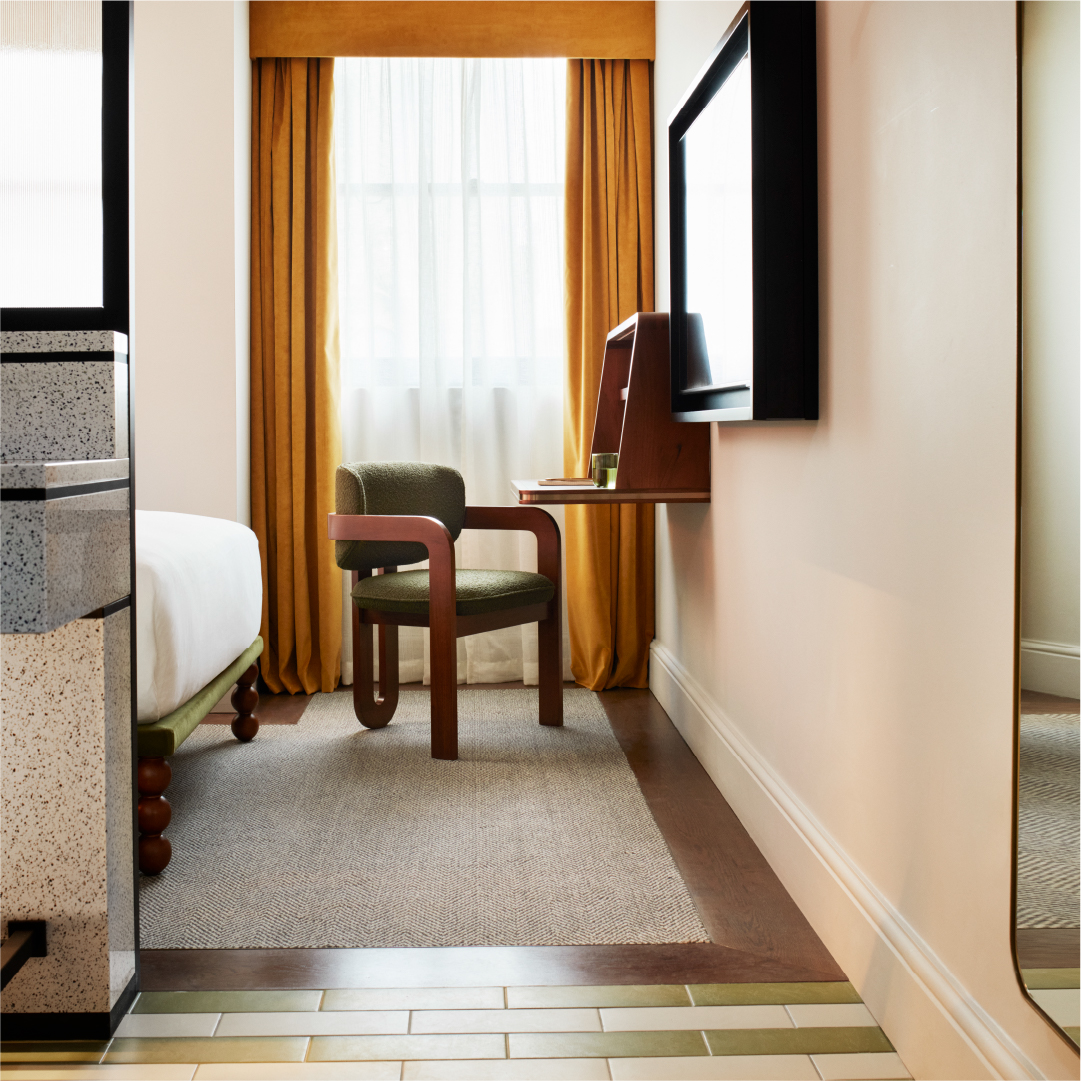 Go all out in our Headliner Suite featuring a King bed, a desk/vanity for work or play, stunning views of Old Bailey, and a standing shower, all in a sprawling space.